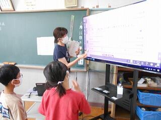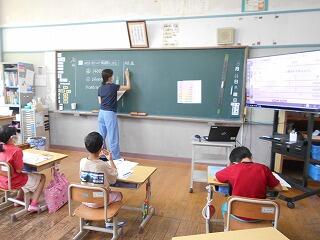 5年生。休んでいる児童と、タブレットを使って遠隔で授業を行いました。