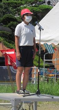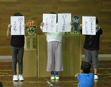 代表の4年生が、「1学期をふり返って」と題した作文を発表しました。「1学期の思いでは、入学式、クラスのこと、外国語活動の学習、国語の新聞作りをがんばったことです。夏休みでは、規則正しい生活を送り、けがや事故のない楽しい夏休みにしたいです。2学期は、自分がやることをしっかりやったり、苦手なことにもチャレンジしたりできるような心をもちたいです。また、運動会もあるので、力を合わせて全力でがんばりたいです。」と述べてくれました。