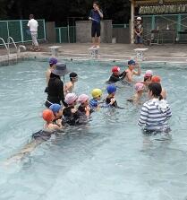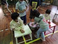 1年生と2年生も、水慣れと水遊びを楽しんでいます。水に長い時間、顔をつけられなかった子どもも、水に少しずつ慣れて、プールの底に沈んでいるお宝を、自分の手でなんとが拾えるようになってきました。