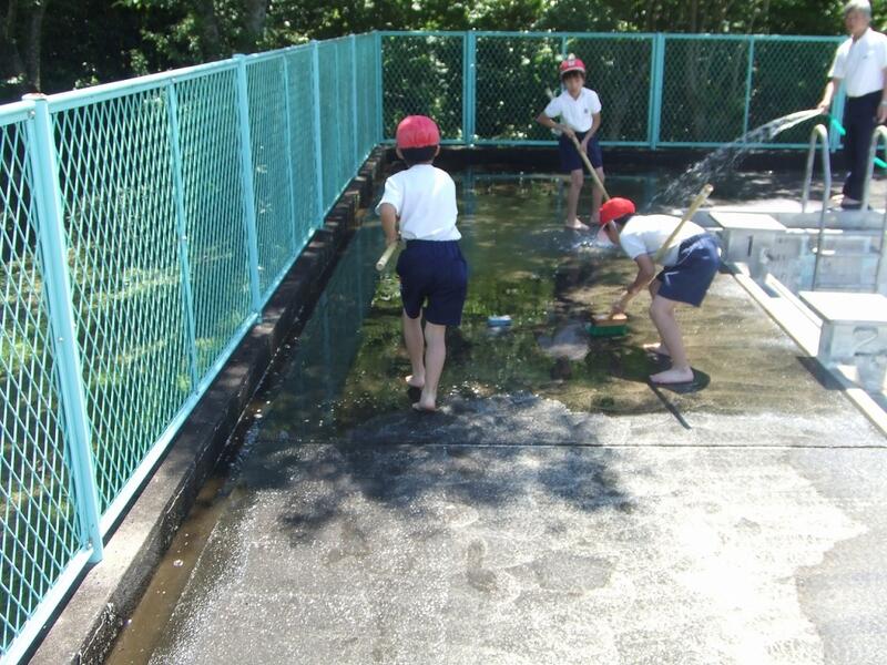 今日の2校時に、全校でプール掃除を行いました。プールの中、プールサイド、更衣室など各学年の担当に分かれて、作業を開始。1時間という短い時間でしたが、デッキブラシでみがいたり、水をまいたりして一生懸命仕事に取り組みました。おかげで、きれいな仕上がりでした。また、先月には技術員さんが洗浄機で作業をしていただいたこともあり、本日のプール掃除もスムーズに行うことができました。水泳の授業は14日(水)からです。今年も好記録を期待しています。