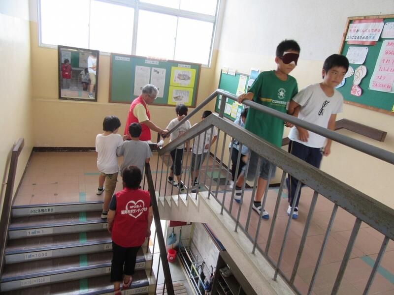 4~6年生11名が、6月23日(金)の総合的な学習の時間に、アイマスク体験をしました。この日は、社会福祉協議会、ボランテイア協会から6名の講師の方々が来校され、指導を受けました。ふだん歩き慣れている階段や廊下も、アイマスクをすると緊張しながら移動していました。限られた時間でしたが、目の不自由な人の気持ち、そしてどのような声かけ・接し方がいいのかということについて考える場となりました。この学習を機に福祉への関心を更に高めて今後に生かしてほしいです。