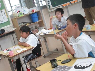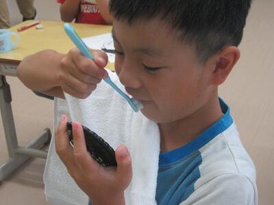 歯垢について学習したあと、染め出し実験をして磨き残しを確認した後、ブラッシングをやってみました。