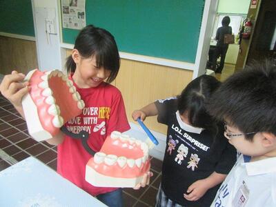 むし歯予防週間の取り組みで、保健の先生から歯みがき指導をしていただきました。