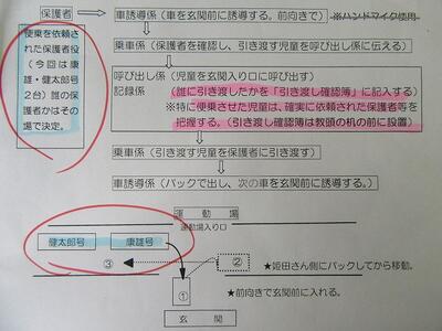 保護者による引き渡し時には、玄関前に自動車を頭から乗り入れてください。