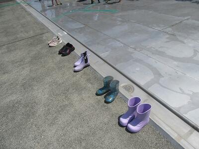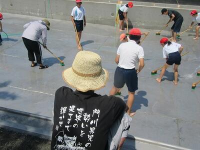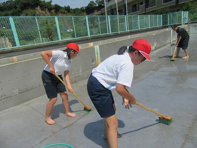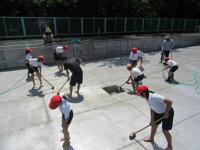 みんなでデッキブラシを使って一生けんめい床を磨きました。