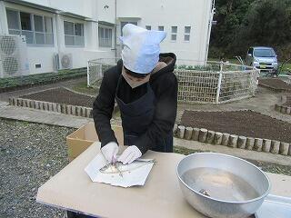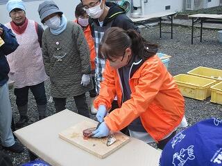 土々呂漁協女性部の方を講師としてお招きして干物体験教室が行われました。