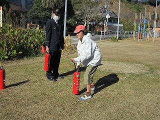 続いて消火器での消火訓練。「火事だー」と大きな声を出してから消火します。