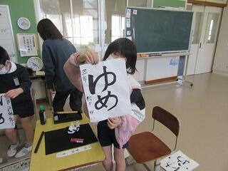 3年生は、書写の学習。毛筆(習字)に挑戦。みんながんばり、のびのびとした仕上がりになりました。