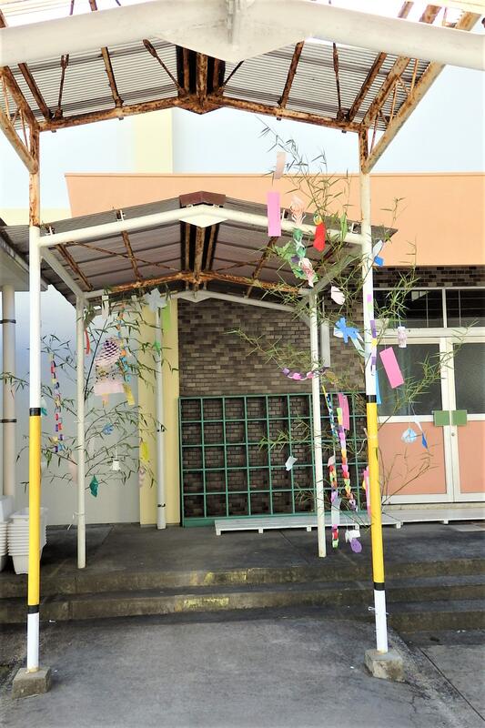 体育館前には、放課後子ども教室で作成した七夕飾りがあります。