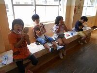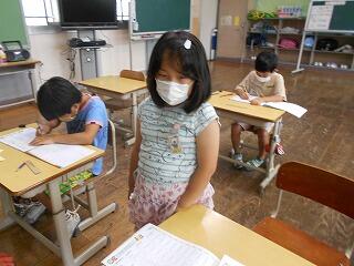 続いて、夏休みの自立貢献についての話を聞きました。それは、4つの目標(チャレンジ・記録・お手伝い・健康)です。頷きながら真剣に話を聴く姿が見られました。