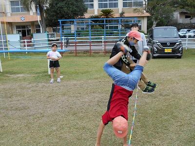 自分の身長よりもゴムの位置が高いのに、何度も足をあげて、なんとか跳び越えようとする姿に、思わず拍手でした。また、ALTのニコラス先生も見守ってくださり、子どもたちが「ニック先生跳べたよ~。」と嬉しそうに、何度も伝える姿がみられました。