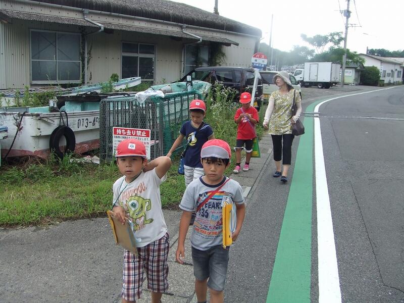 6月21日(水)に、2年生が町たんけんに行きました。行き先は、学校から徒歩で20分ほどのところにある公園です。公園のそばには、車えびを養殖しているところもありました。また、公園の草むらにいたバッタを見付けて、追いかけたり、道ばたに咲いている紫陽花を見つけたりして、身の周りの自然にもふれることができました。また、公園の奥には、高台に緊急時の避難場所があり、自分たちの目で場所を確認しました。そこに設置されていた備蓄倉庫にも関心を示し、防災との関わりの学習にもなりました。