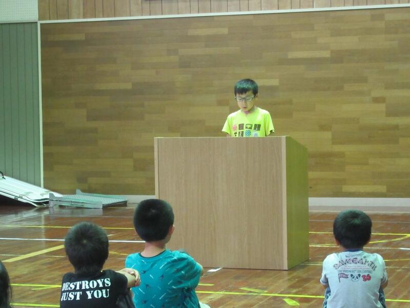 7月22日(月)1校時に、第1学期の終業式を行いました。4年生の森悠人さんが1学期の間に成長したことを、堂々と立派に発表してくれました。
