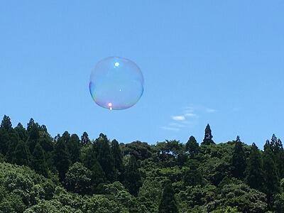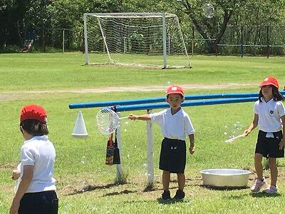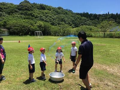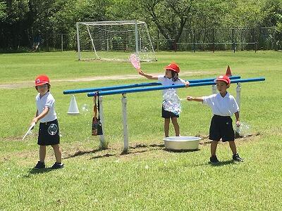 7/2(木)4校時から1・2年は生活科「夏の遊びを知ろう!」を学びました。昭和の頃は家庭用洗剤を水で薄め、シャボン玉をよく作ったものです。最近は、公園や各家庭の庭先でシャボン玉遊びををしている姿をあまり見なくなってきました。快晴の空の下、子供たちは、元気よく活動することができました。