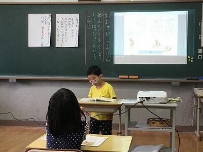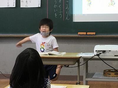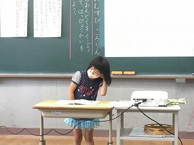 今日は、「おもすびころりん」の発表(読み声)がありました。3人の児童が、主人公のおじいさんの気持ちを考えながら、動作を交え、元気よく発表することができました。