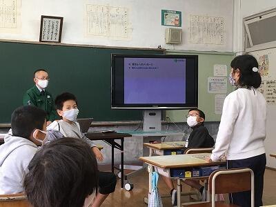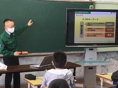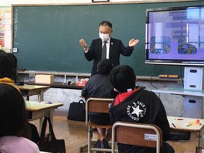 11月6日(金)、3・5年生対象にふるさと教育推進事業「子どもたちに伝えたいこと」を実施しました。(株)キヨモトの清本英義さまを講師にお招きし、生きていく上で「目的」と「目標」を明確にすること、考え続けることや挑戦を続けることの大切さなどを学ぶことができました。地元企業の一線で活躍されている清本様の仕事にかける熱い思いが伝わってきました。