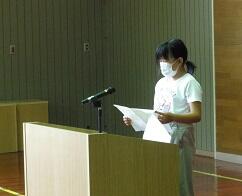 代表の4年生が、「1学期をふり返って」と題した作文を発表しました。「1学期の思いでは、入学式、クラスのこと、外国語活動の学習、国語の新聞作りをがんばったことです。夏休みでは、規則正しい生活を送り、けがや事故のない楽しい夏休みにしたいです。2学期は、自分がやることをしっかりやったり、苦手なことにもチャレンジしたりできるような心をもちたいです。また、運動会もあるので、力を合わせて全力でがんばりたいです。」と述べてくれました。