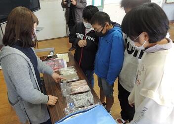 (株)マルワ水産は、漁だけでなく、獲れた魚を加工して、販売までする会社だというお話を聞き、子どもたちはビックリするリアクションが見られました。第6次産業とも言われるとのことでした。漁の仕方(深海底曳漁)を、縮小模型をもとに説明してくださったり、獲れた魚を写真で見せてくださったりしました。また、加工した実物やパンフレットをもとに加工や販売の様子についても説明してくださいました。、「できることをとにかくやってみると生活が潤ってくる。」ということもお話しいただきました。