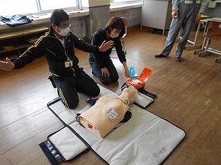 講話のあと、消火器の扱い方を学びました。(ちなみに、本校職員が、講師のお一人を2年生の時に担任しました。)