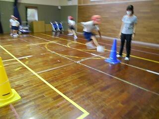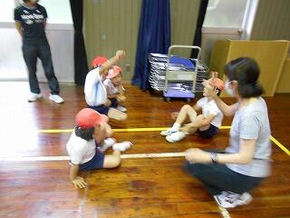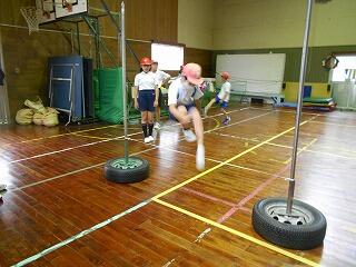 5月30日(月)、雨なので、体育館での体育です。今日は「跳」の運動。