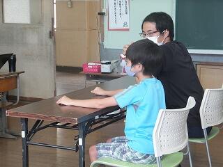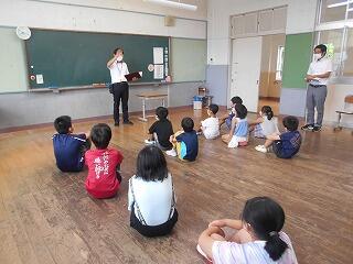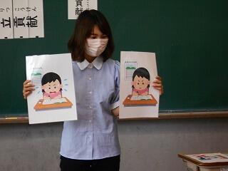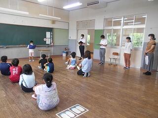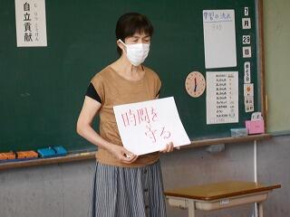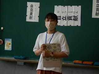 続いて、夏休みの自立貢献についての話を聞きました。それは、4つの目標(チャレンジ・記録・お手伝い・健康)です。頷きながら真剣に話を聴く姿が見られました。
