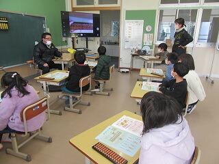延岡南分署の消防士の方々から、火災についてのお話を聞き、その後、消火器の使い方を学びました。