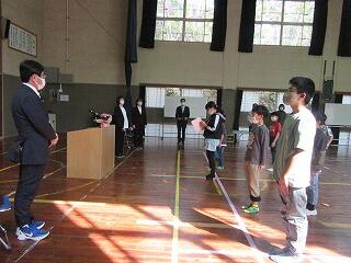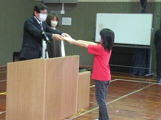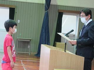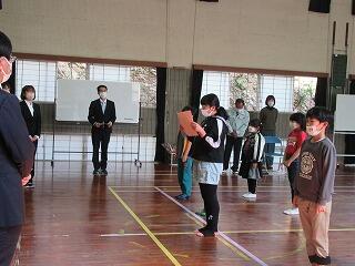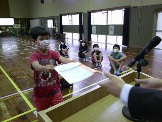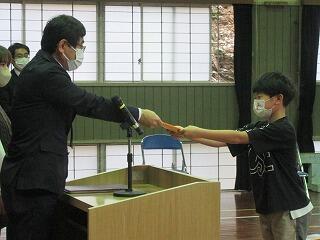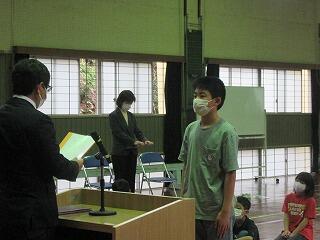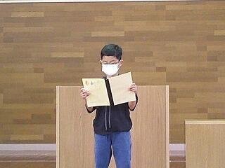 今日は、令和4年度の終了の日。体育館で修了式を実施しました。修了証書が各学年の代表児童に授与されました。代表児童の 作文発表では、この1年でがんばったことを3年生が堂々と発表する姿が見られました。