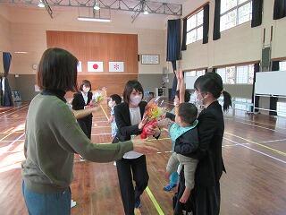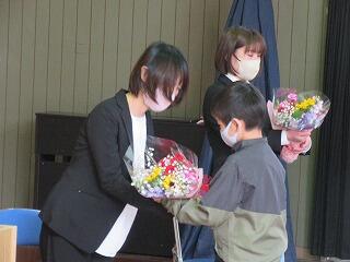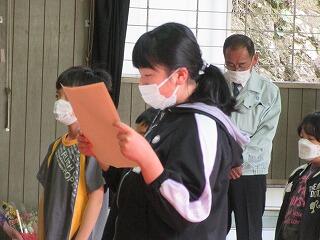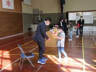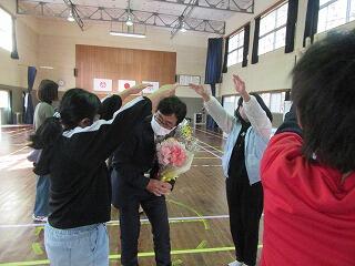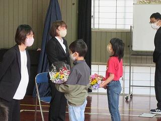今日は登校日。そして、離任式を実施しました。満開のサクラの咲く中、先生方とのお別れの式。お世話になった2名の先生が 退職され、1名の先生が産休に入られることになりました。式では、3名の先生方のごあいさつのあと、5年生が児童代表として、 お一人お一人の先生方へ、今までのお礼と感謝のことばを述べてくれました。そして、代表児童から、3名の先生方へ花束が渡さ れました。式の終わりは、会場の全員で、花道をつくり見送りました。