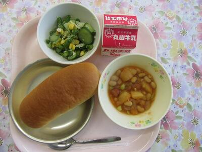 今日の給食は、家庭ではあまり出ない?大豆たっぷり「チリコンカン」でした-(^_^)
