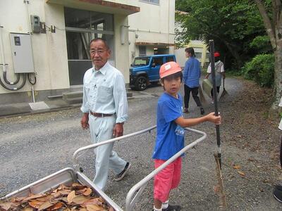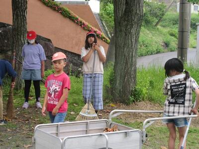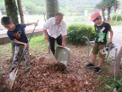 朝のボランティアのようすです。今日はみんなで落ち葉拾いをしました。
