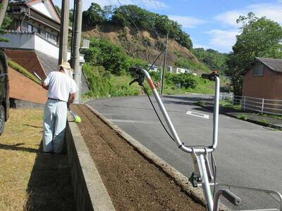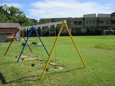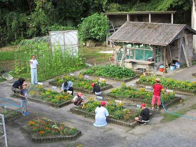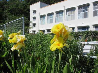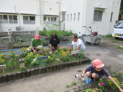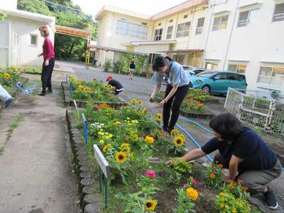 お花が咲き乱れる名水小。坂本先生が夏の花だんの準備をされていました。ブランコもピカピカに☆