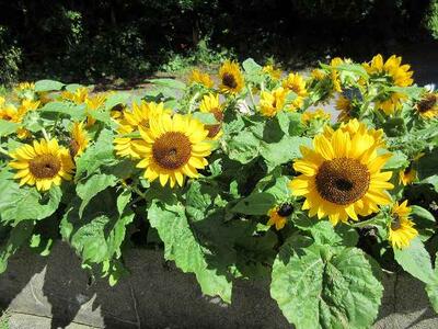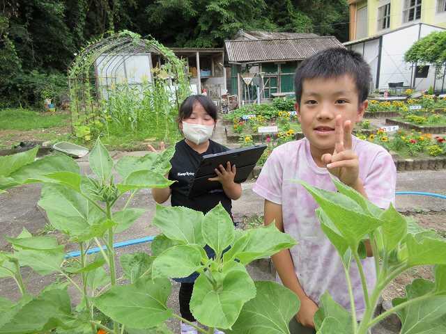 3年生理科。植物の花の観察をしました。ひまわりが大きく育って身長を超しそうです。