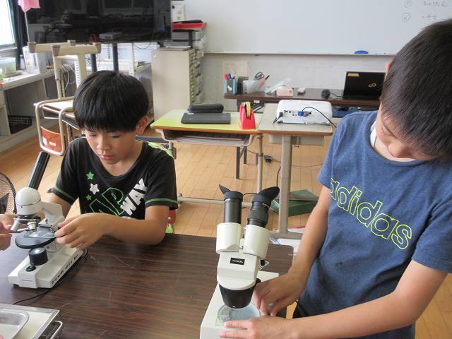 4年生理科。花粉の観察を顕微鏡で行いました。いろいろな形や色の花粉を観察できました。