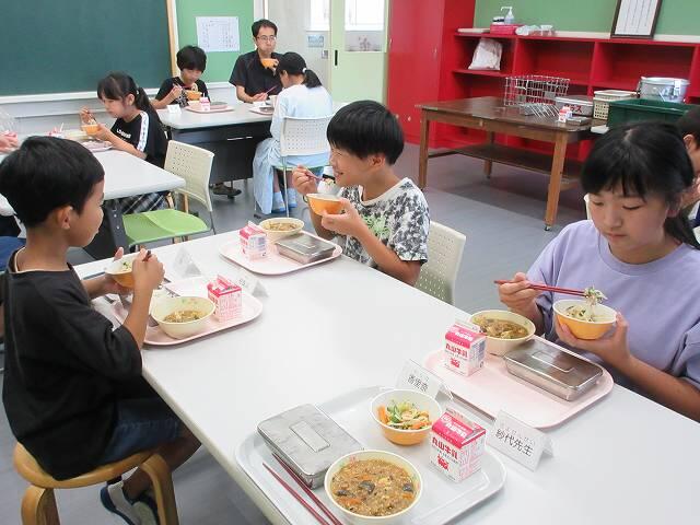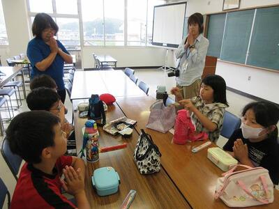 昨日から、気温上昇のためエアコンのある多目的室で給食をとることにしました。