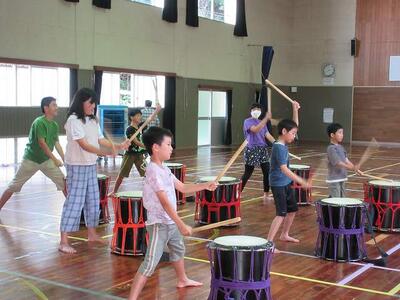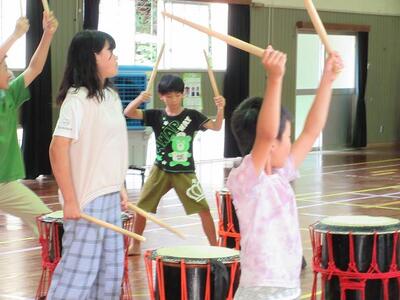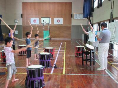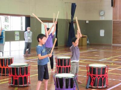 放課後子ども教室では、太鼓の練習が始まり、元気な太鼓の音が鳴り響いていました。
