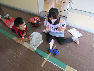 3年生理科。「風のはたらき」風の強さによって、ものを動かす力が変わるかの実験をしました。