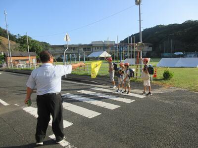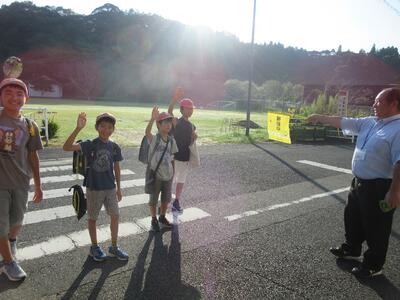 秋の交通安全週間。校長先生が旗をつかって登校指導をしてくださっています。