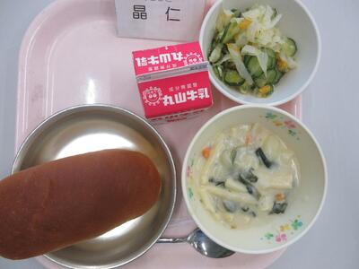 今日のメニューはマカロニのクリーム煮とフレンチサラダ、黒糖パンでした。