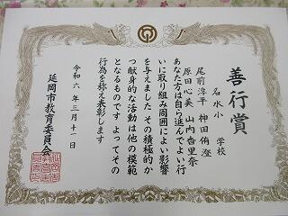 日頃のがんばりが認められて、6年生が善行児童の表彰を受けました。