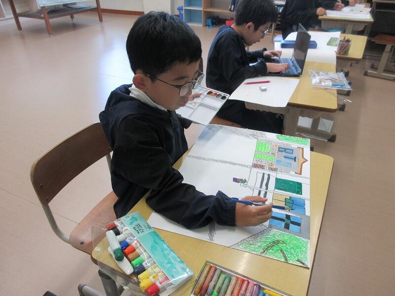 1年生と4年生の教室では、図工の作品制作が行われていました。