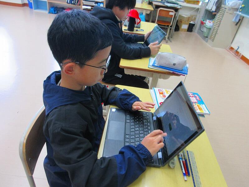 5年生は、タブレット端末を使って活動中です。