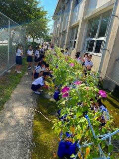 7月14日の生活科の授業では、さいたあさがおの花を使って、色水遊びをしました。ふくろに、花と少しの水を入れて色水を作り、作った色水で画用紙に色ぬりをしました。