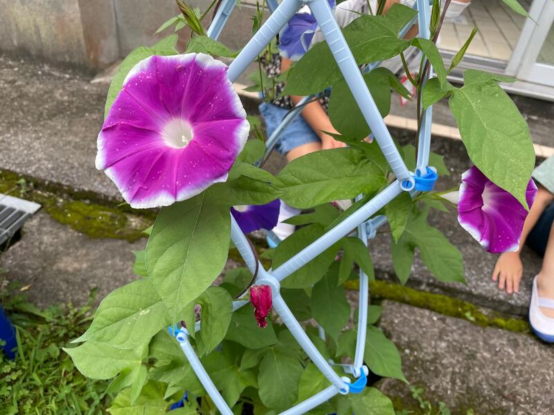生活科の授業で育てたあさがおが、ぐんぐん伸びてきました。毎朝あさがおの水やりをがんばっており、「◯こ花が咲いた!」と、嬉しそうな笑顔を見せてくれます。