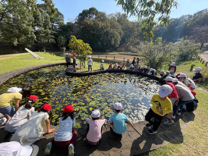 公園で元気に遊び、金堂ヶ池の散策をしました。