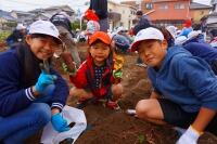 しかし、畑に行ってみると足場がぬかるんでいました。。。泥水でたくさん汚れましたが、幼稚園児に優しく声をかけたり、一緒に植えたりして、楽しく交流できました。