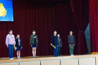 各学級から代表1名ずつが、6年生から黄金のバトンを受け取り、最上級生になるにあたっての決意を全校児童の前で堂々と発表することができました。