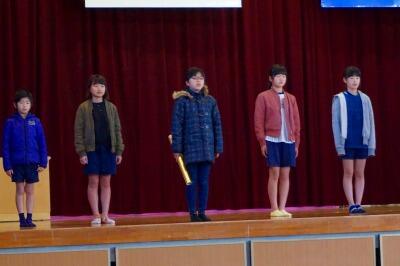2月の引継ぎ式で6年生から金のバトンを受け取った5年生。