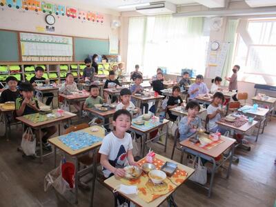 担任や栄養教諭の指導を受けながら、「ごはんと味噌汁」を作りました。初めての調理でしたが、班の友達と協力しながら作り上げることができました。