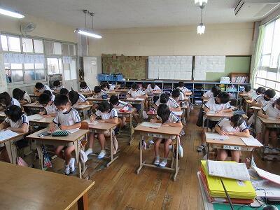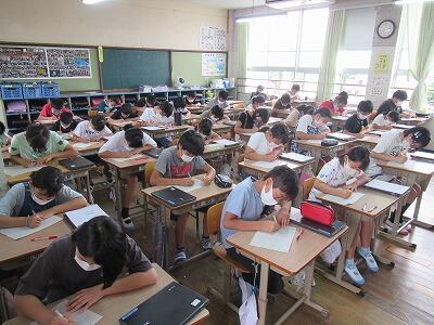 初めに音読をした後、100マス計算に取り組みます。5年生のどのクラスにも緊張感がただよい、子どもたちが一生懸命取り組んでいました。