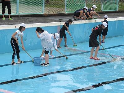 7月からの水泳学習に向けて、6年生がプール清掃を行いました。